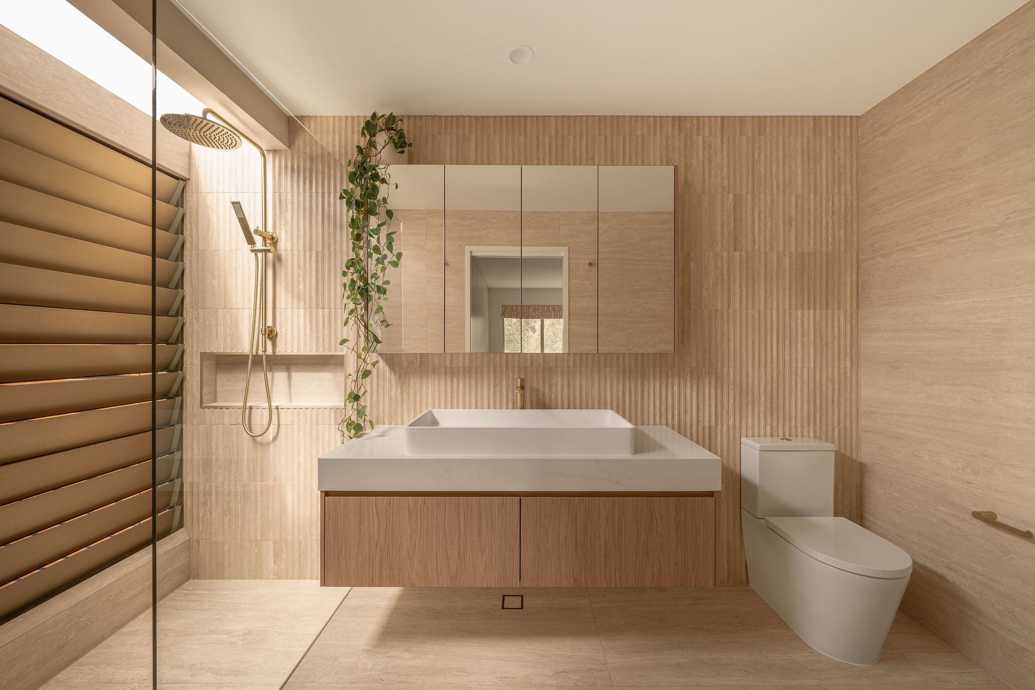 • The kitchen was reconfigured to better suit the owners, complemented by natural stone finishes across the bathrooms.